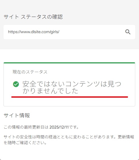 結果は、「安全ではないコンテンツは見つかりませんでした」と表示され、がるまには安全なサイトと判断されています。